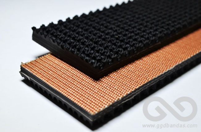 Bandas transportadoras nervadas de goma negra con nervio. Son aptas para transportar productos a granel con inclinación superior a 18-20o y hasta 45o.