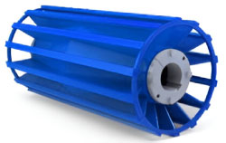 La polea de jaula de ardilla opera en función de su geometría y rotación. Comúnmente son utilizadas en etapas de trituración primario de servicio medio, donde su desempeño se basa en cuidar la integridad de la banda ante un esfuerzo al introducir al material entre polea y banda.